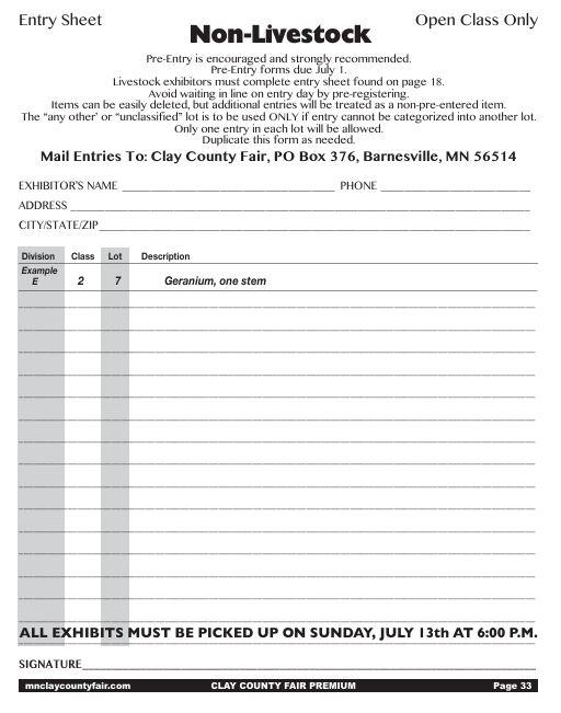 All entries must be made and exhibits brought in Thursday from 8:00am until 8:00pm. Perishable items, such as flowers, fresh vegetables, and sheaf grains, must be entered on Thursday, but can be brought in and put in place by 8:30am Friday.
